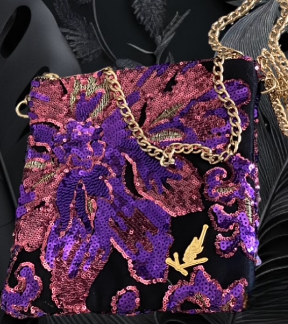 Cartera Brillo rebordada en canutillo color rosa y violeta, con cadena dorada media larga .