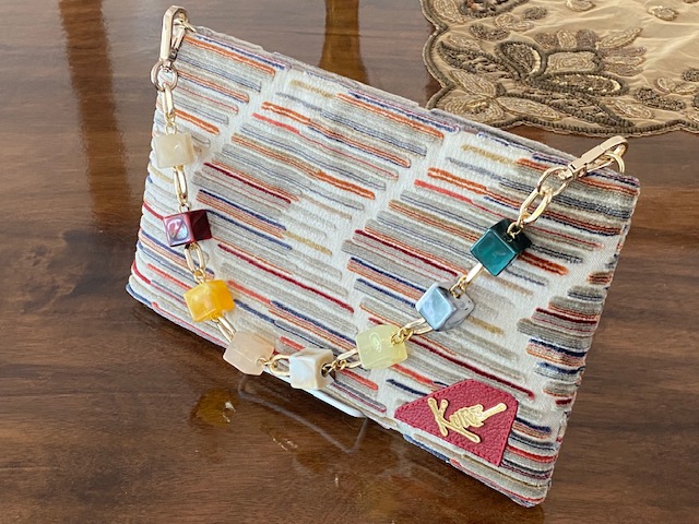 Cartera KIOTO en velvet tonos tierra, con manija en cubos multicolor.