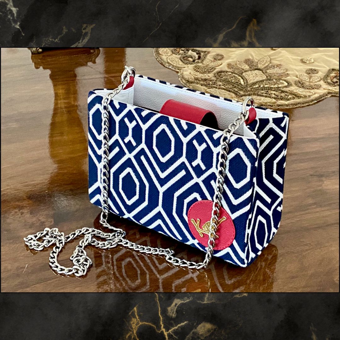 Cartera Minie Real en lino azul y blanco, lengüeta en cuero rojo y cadena larga en color plata.