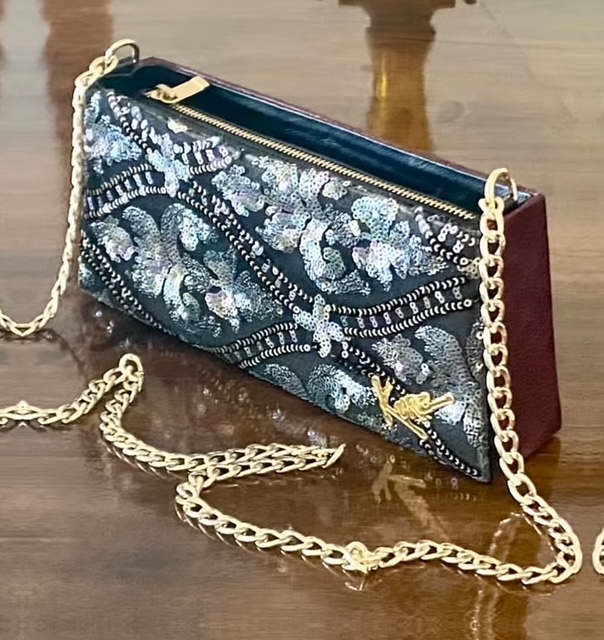 Cartera ROMA de la linea Luxury, rebordada en canutillo color plata con respaldo y laterales en cuero color vino.